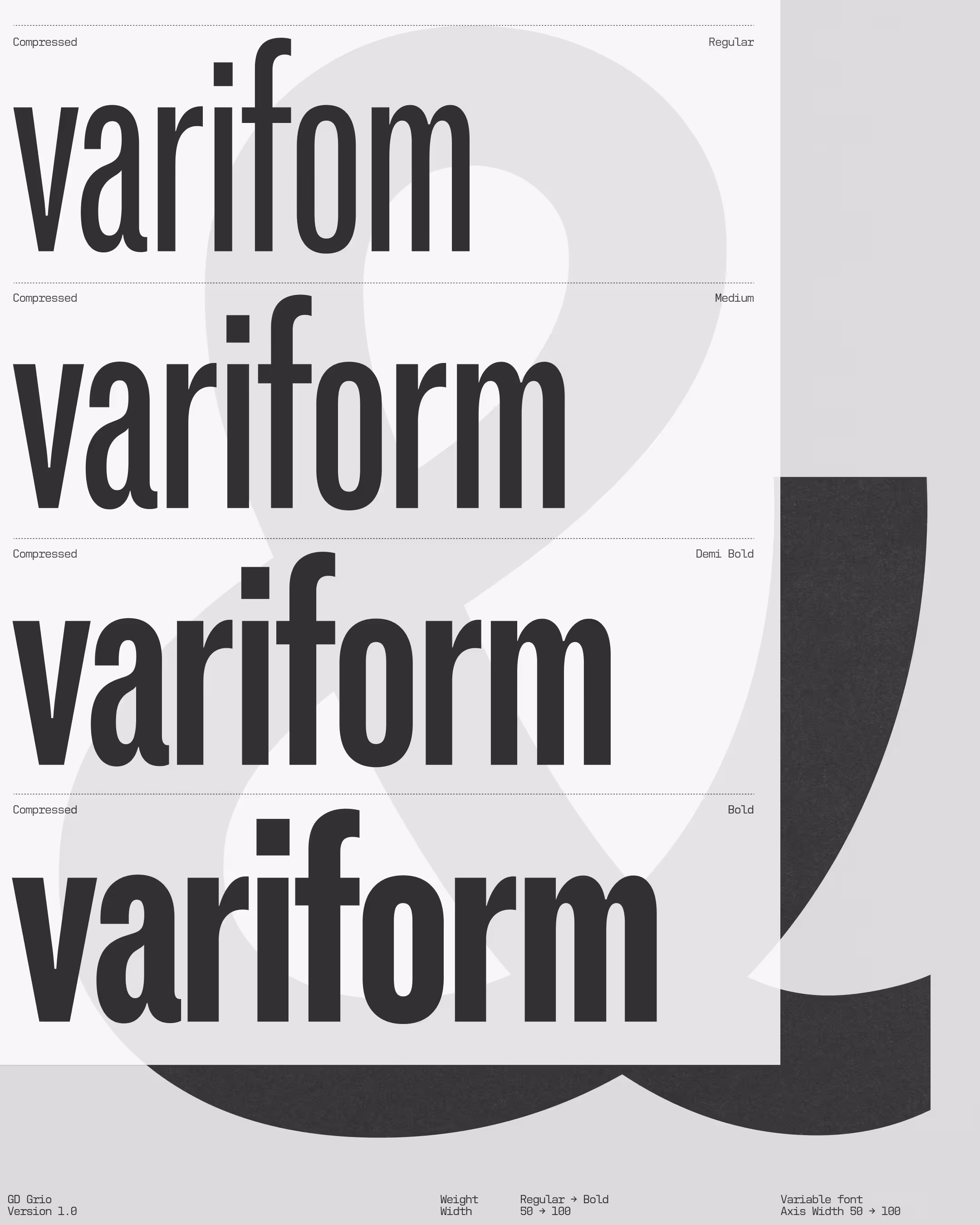 Imperfectly Perfect Since 1907. GD Grio, is a love letter to the quirks and character of early grotesques. Rooted in Venus Grotesk (released in 1907 by the Bauer Type Foundry), it celebrates the raw, human charm of a transitional era in typography, where 19th-century eccentricity met 20th-century clarity. Grio embraces the imperfect: awkward proportions, curious terminals, and a wonderfully wonky single-storey 'g'. Reimagined as a variable font, it flexes seamlessly between clean body text and bold headlines.