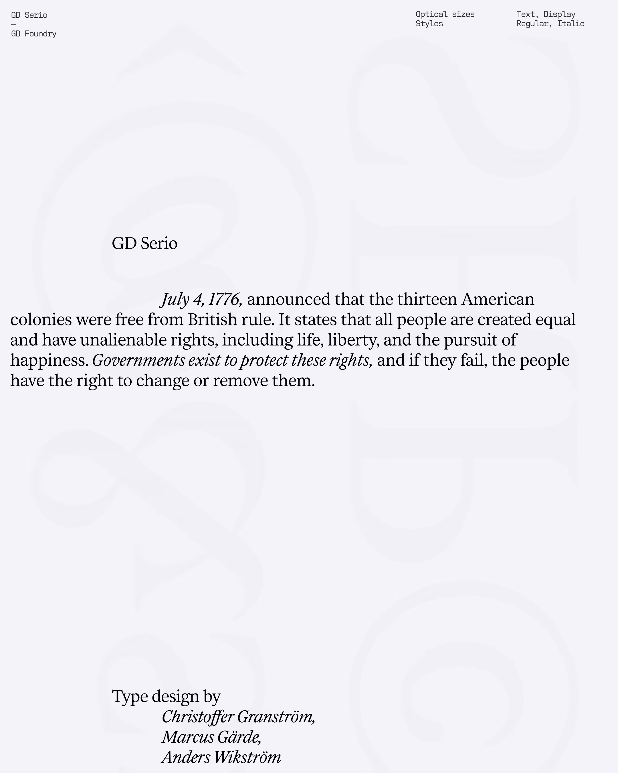 GD Serio, inspired by the humanistic features of 18th-century typefaces such as Baskerville and Caslon. GD Serio features delicate details and an open bowl in the lowercase ‘g’, creating a charming yet crisp appearance. The typeface is complete with small capitals, proportional numbers, and old-style numbers. It is a versatile workhorse for body text and comes in two distinct optical weights: Display and Text, ensuring optimal readability and aesthetic appeal across different applications.